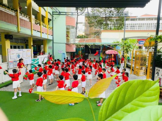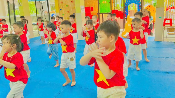 💫 Hơn 150 trẻ đến từ các lớp Mầm – Chồi – Lá đã đồng loạt tham gia màn đồng diễn tập thể trong âm vang hào hùng của những ca khúc mang đậm tinh thần dân tộc như: “Việt Nam ơi”, “Như có Bác Hồ trong ngày vui đại thắng”. Mỗi bước nhảy, mỗi cánh tay giơ cao, mỗi ánh mắt rạng rỡ trên khuôn mặt thơ ngây đều thắp lên tinh thần yêu nước từ những năm tháng đầu đời.