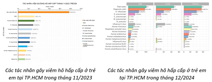 Về tác nhân gây bệnh, kết quả báo cáo từ chương trình nghiên cứu tác nhân viêm phổi cộng đồng hợp tác giữa Đơn vị Nghiên cứu Lâm sàng Đại học Oxford (OUCRU) với Bệnh viện Bệnh Nhiệt Đới, Bệnh viện Đa Khoa tỉnh Khánh Hoà, Viện Pasteur Nha Trang, và Trung tâm bệnh truyền nhiễm quốc gia Singapore (thuộc dự án PREPARE) cho thấy tác nhân gây bệnh vẫn là các virus và vi khuẩn phổ biến. Cụ thể kết quả xét nghiệm 103 bệnh nhân viêm phổi cộng đồng (gồm 56 trẻ em và 47 người lớn) nhập viện từ tháng 7 đến tháng 12 năm 2024 tại Bệnh viện Bệnh Nhiệt Đới TPHCM cho thấy: HMPV chiếm tỷ lệ nhỏ (12,5% ở trẻ em) so với các tác nhân gây viêm phổi cộng đồng khác. Các tác nhân phổ biến hơn được tìm thấy ở trẻ em như vi khuẩn H. influenzae (71,4%), S. pneumoniae (42,9%), virus cúm A (25%), rhinovirus (44,6%), RSV (41,1%), … Tác nhân phổ biến ở người lớn là vi khuẩn H. influenzae (42,6%), S. pneumoniae (27,7%) và virus cúm A (48,9%). Ngoài ra, trong đợt bùng phát viêm hô hấp trẻ em vào cuối năm 2023 tại Thành phố Hồ Chí Minh, kết quả giám sát cũng ghi nhận tình trạng đa dạng tác nhân virus thường gặp,trong đó tác nhân HMPV cũng được phát hiện với tỷ lệ 15%.