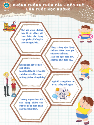 Xây dựng chế độ dinh dưỡng hợp lý cả ở trường học và ở nhà. Cho trẻ ăn đúng giờ theo bữa, đảm bảo đa dạng thực phẩm, đáp ứng nhu cầu dinh dưỡng theo lứa tuổi. Không cho trẻ ăn quá nhiều thức ăn ngọt (bánh kẹo, nước ngọt, chè, kem, …), thức ăn béo (trà sữa, thức ăn nhanh, đồ chiên, xào, mỡ động vật, …).