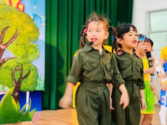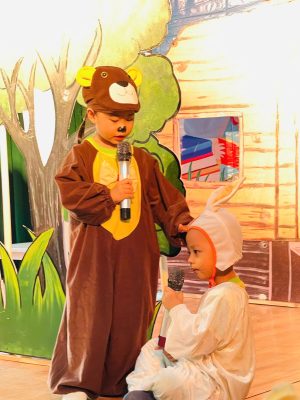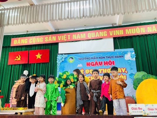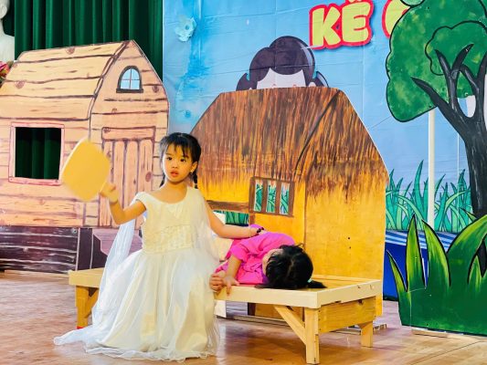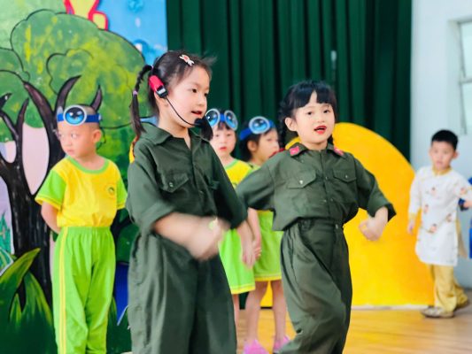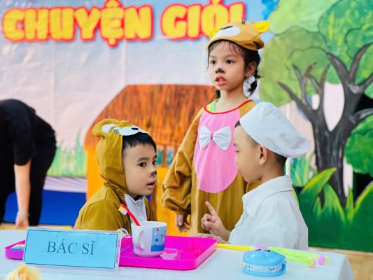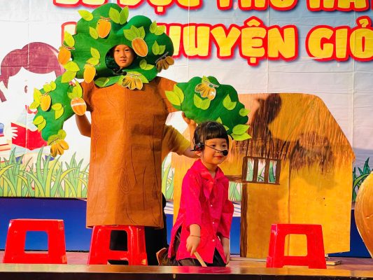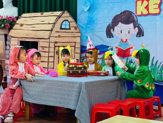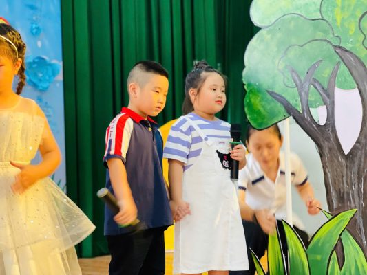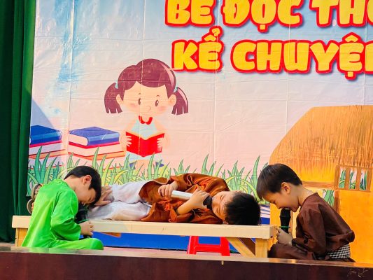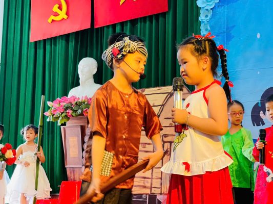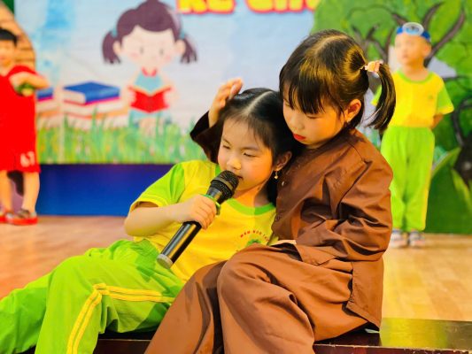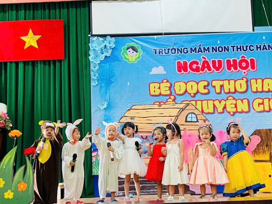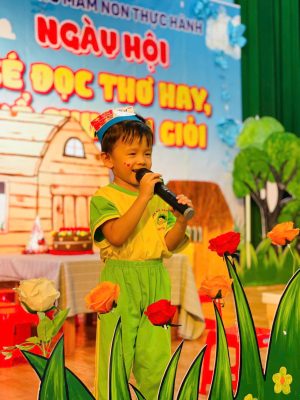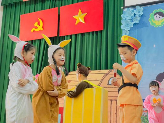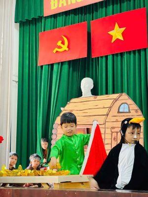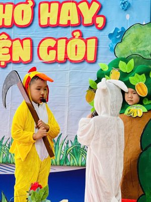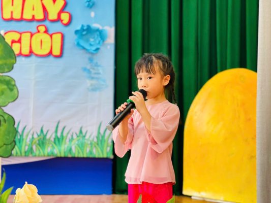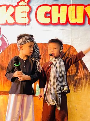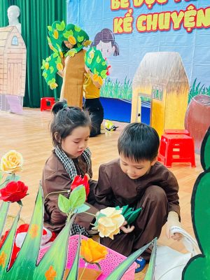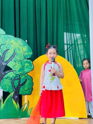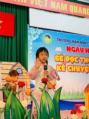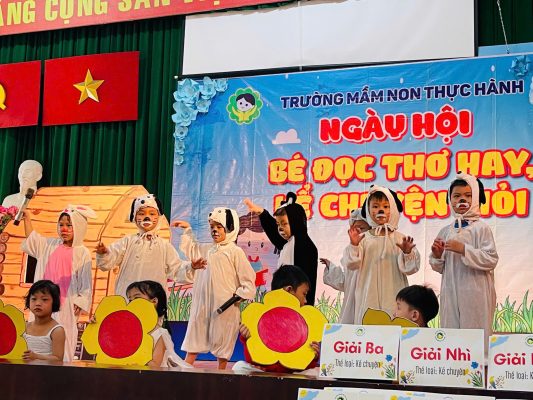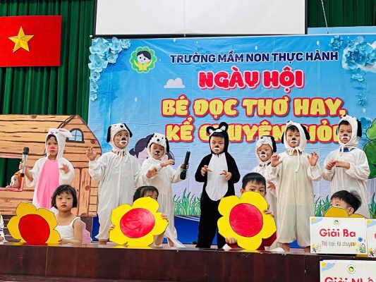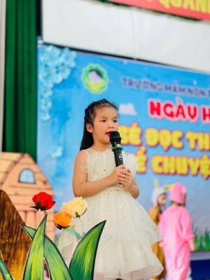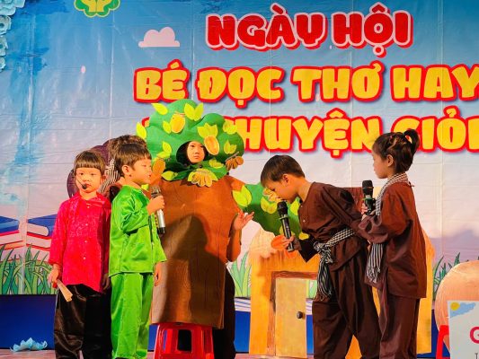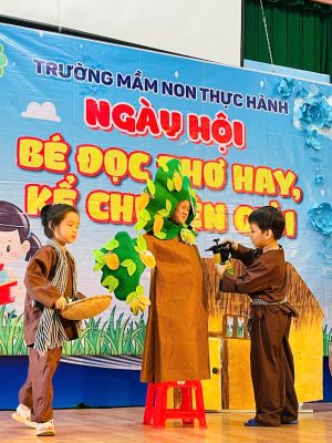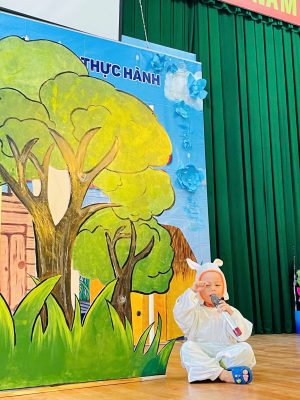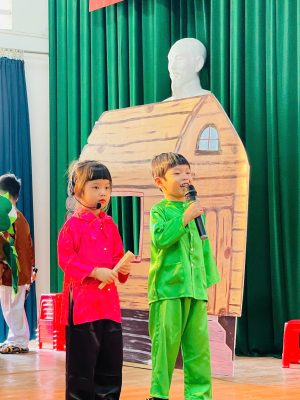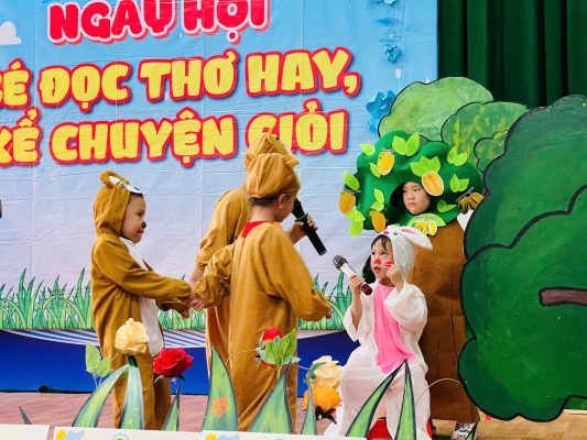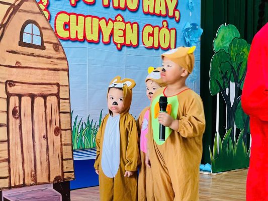 Mỗi tiết mục trong ngày hội đều là một dấu ấn đặc biệt, mang đến những cảm xúc đáng nhớ. Từ những vần thơ trong trẻo, tràn đầy cảm xúc đến những câu chuyện cổ tích quen thuộc được các bé tái hiện một cách sinh động, tất cả đều khiến khán giả thích thú và vỗ tay không ngớt. Các bé lớp Mầm, Chồi, Lá đã hóa thân thành các nhân vật trong truyện với những màn diễn đáng yêu và hồn nhiên. Cáo ranh mãnh, Thỏ hiền lành, Bác Gấu ấm áp, anh Khoai thật thà, Ông Bụt nhân hậu… lần lượt xuất hiện trên sân khấu, mang đến những giây phút vui tươi, đầy màu sắc tuổi thơ. Không chỉ là một cuộc thi, ngày hội còn là dịp để các bé học hỏi lẫn nhau, rèn luyện sự mạnh dạn và biết cách phối hợp với bạn bè khi đứng trên sân khấu. Mỗi bé đều là một ngôi sao sáng, tỏa ra ánh sáng của sự tự tin và niềm vui khi được thể hiện bản thân.
