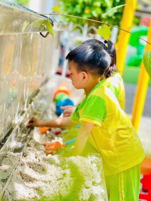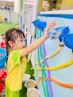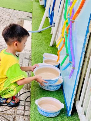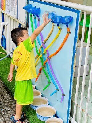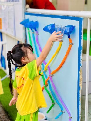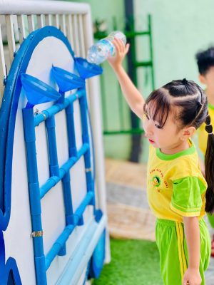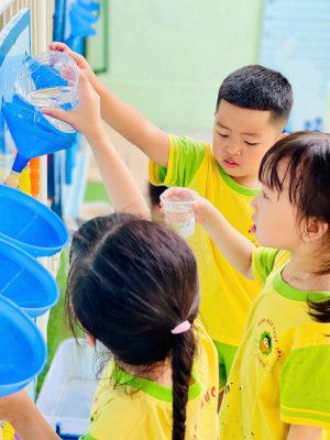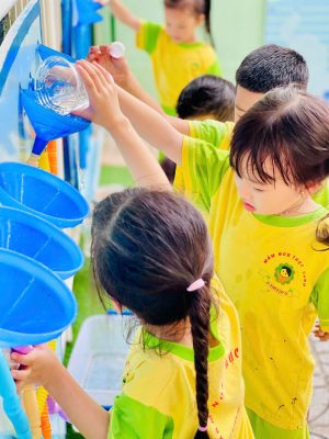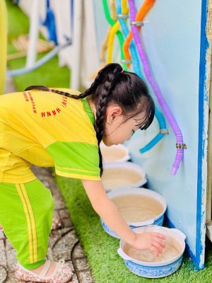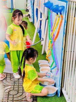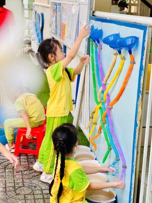 Trẻ say sưa múc nước, xây cát, lắp ghép ống dẫn, cùng nhau chia sẻ đồ chơi, hợp tác để hoàn thành trò chơi. Các cô giáo nhẹ nhàng quan sát, hướng dẫn, khích lệ từng bé, giúp trẻ phát triển kỹ năng vận động, tư duy sáng tạo và kỹ năng giao tiếp.